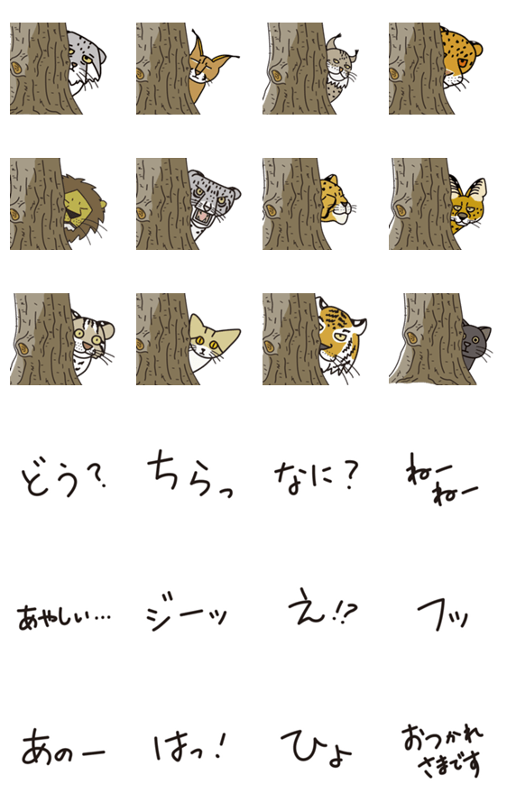 木の陰からひょっこりと顔を出すネコ科動物たち。その時に合わせて入れられるコメント入り。長押しして組み合わせて使ってみよう!