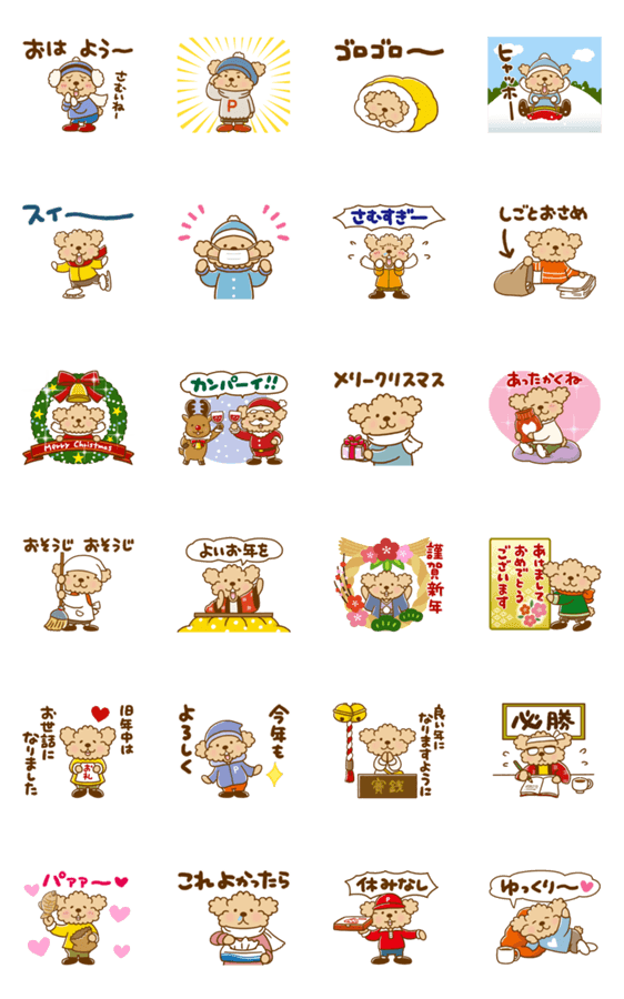 トイプードルのぷう太郎の動く冬スタンプの第二弾。ぷう太郎と楽しく冬を過ごしましょう。寒い日/冬/クリスマス/仕事納め/年末年始/お正月
