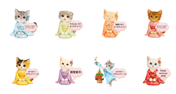 お正月や新年のあいさつに使える、かわいいねこのスタンプです。 新年のごあいさつや、気持ちを伝えたいときに使いやすいスタンプを収録しています。