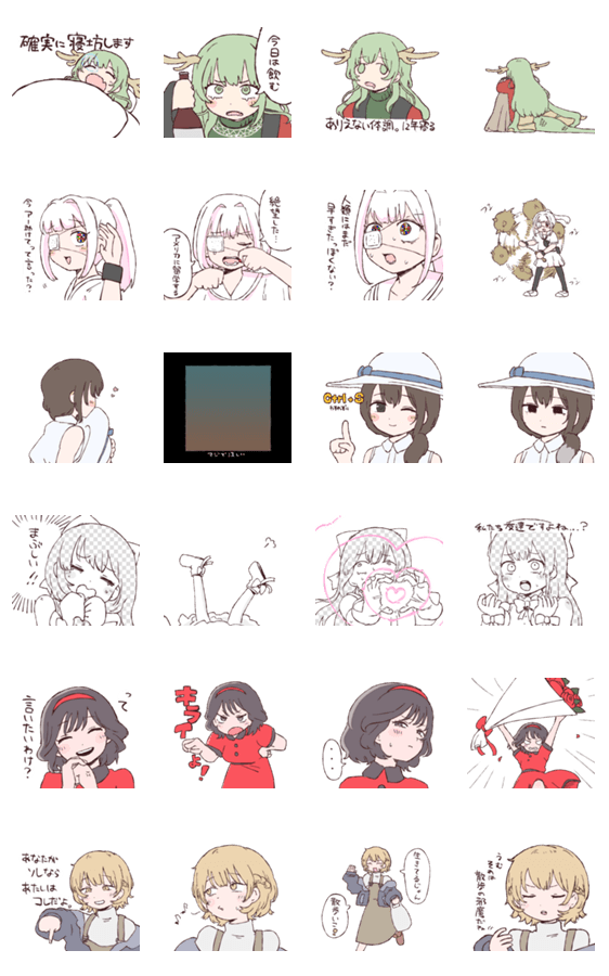 ボカロP・いよわのMVに登場するキャラクターたちのスタンプです。【内容】ゆめみるうろこ/クリエイトがある/うわがき/わすれモノ/SLIP/散歩の邪魔