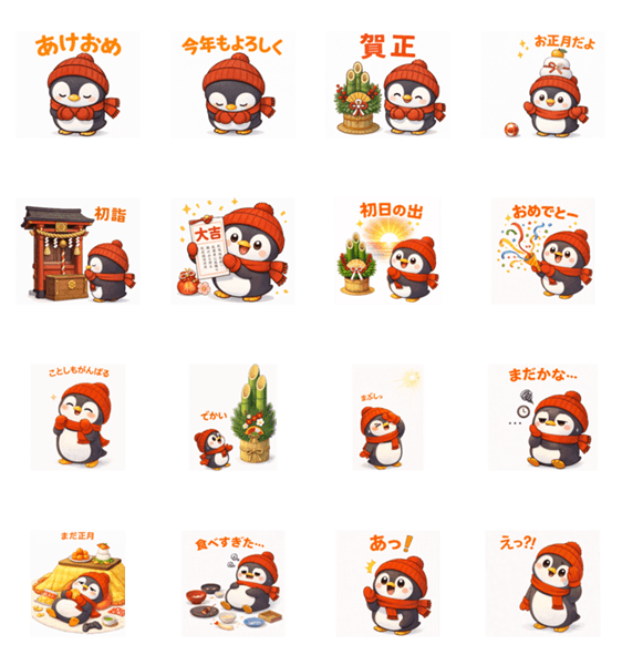 赤いニット帽がトレードマークの「さむペン」のお正月スタンプです。全年使えるスタンプです。