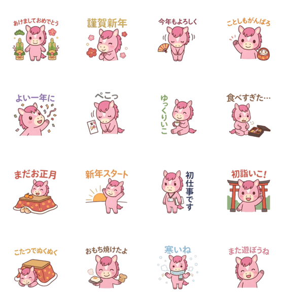 2026年・午年のお正月にぴったりな、 ピンク色の馬のほっこりかわいいLINEスタンプです。新年あいさつから、お正月明けにも使いやすい日常フレーズまでたっぷり収録。