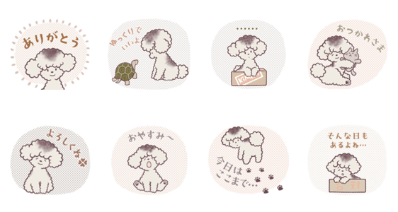 ちいさなプードル「キムチ」が、 そっと気持ちを届けてくれるスタンプです。 ゆっくりでいいよ、今日はここまで。 日常のやりとりに、やさしい一言をどうぞ。