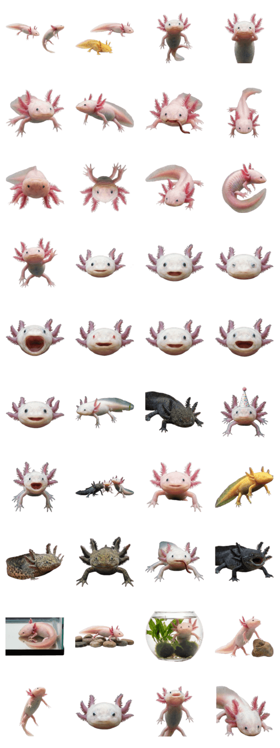 スタンプ 両生類 水生生物 かわいい つぶらな目 ふさふさ外鰓 写真風 リアル 癒し系 観察 生き物 ペット系 ナチュラル LINE トーク 使いやすい 人気