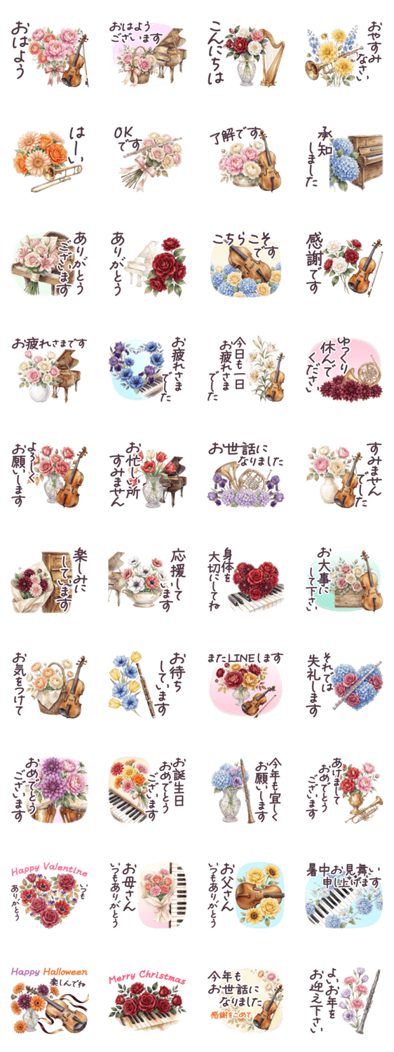 オーケストラ楽器と花がテーマのシンプルスタンプ。ママ友/先輩/友達/家族/丁寧/挨拶/敬語/パリ/花/お花/ブーケ/花束/年中/年賀状/正月/ピアノ/バイオリン/チェロ/音楽