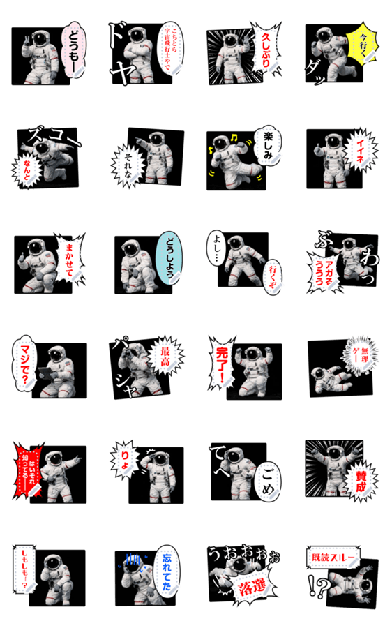 リアルな宇宙飛行士のコミカルな漫画の吹き出し風フレームに好きな文字入力できます!宇宙規模の会話から日常挨拶など自由な発想でユニークなトークを♥ 現在この商品は一部のスマートフォン版LINE 10.3.0以上のトークルームでのみ使用できます。動作環境の最新情報はヘルプをご確認ください。