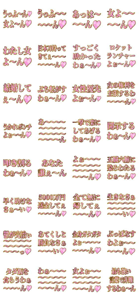 | スタンプ説明 | 【ラブ/強い/理論武装/女性/権利/組み合わせ/構文/語録/ストロングスタイル/モンスター/異常/発光/美女/愛/文字デザイン/ピンク/うるさい/女アピ/救済/なにこれ/その他】 |