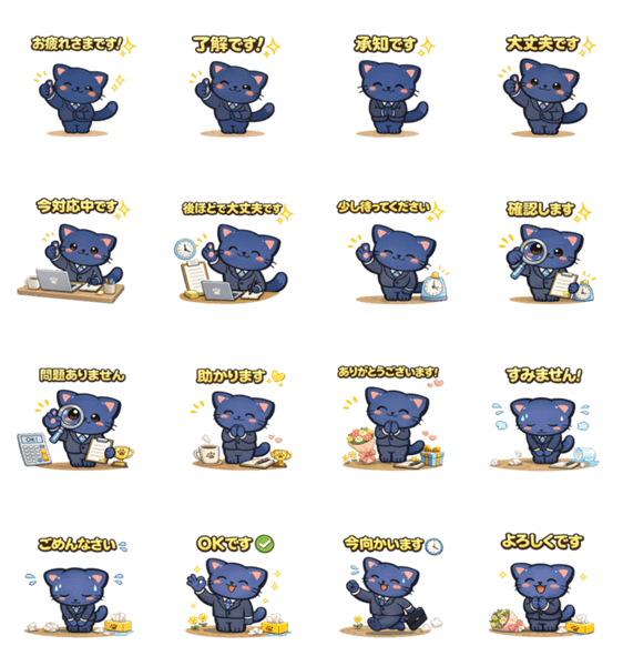 社内チャットで毎日使える、 少しくだけた敬語表現を集めたネイビーねこのスタンプです。 かたすぎず、失礼にならない 社内コミュニケーションに最適な16枚セットです。