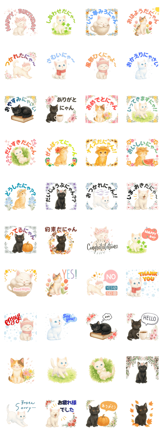 水彩画タッチのねこたちが、 日常の気持ちや季節のあいさつをやさしく伝えるほっこりスタンプです。