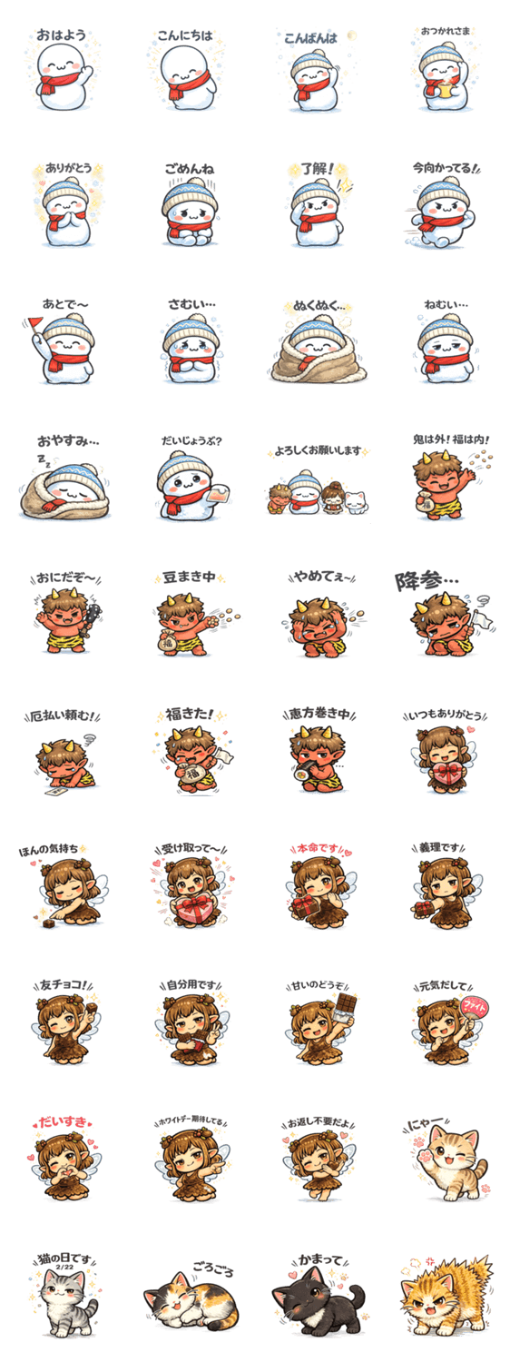 雪だるま・ちび鬼・ちょこ妖精・猫が大活躍!冬のあいさつから節分、バレンタイン、猫の日も使える、かわいい季節スタンプセット。日常トークにも便利!