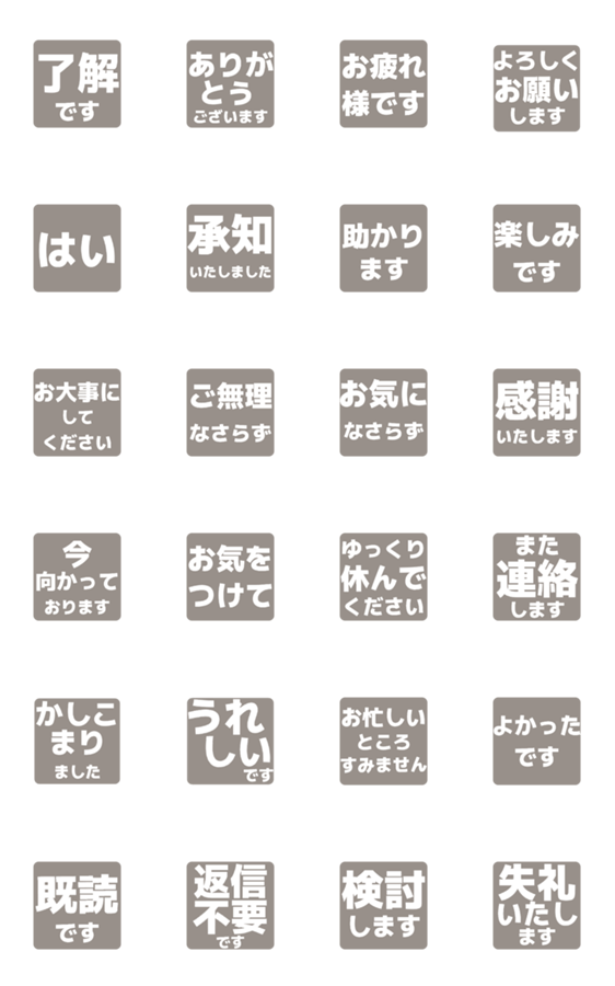 大人に似合う落ち着いたグレージュ×白文字で見やすいシンプルなスタンプです。ママ友・お仕事・学校関係の連絡に丁寧で最適です。了解 承知 お疲れ 大事 返信不要