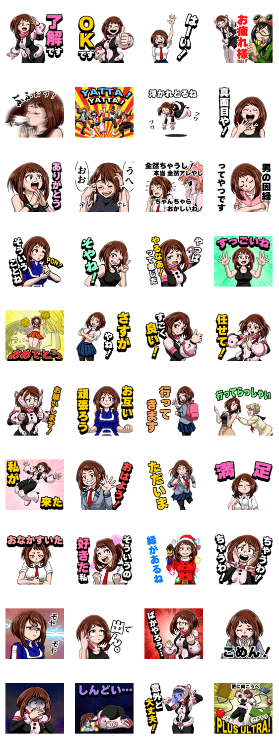 「僕のヒーローアカデミア」より麗日お茶子(うららか おちゃこ)こと ≪ウラビティ≫ のスタンプを作りました。時々、三重弁が出ます。 ※LINE Creators Collaboration 僕のヒーローアカデミア参加スタンプです。