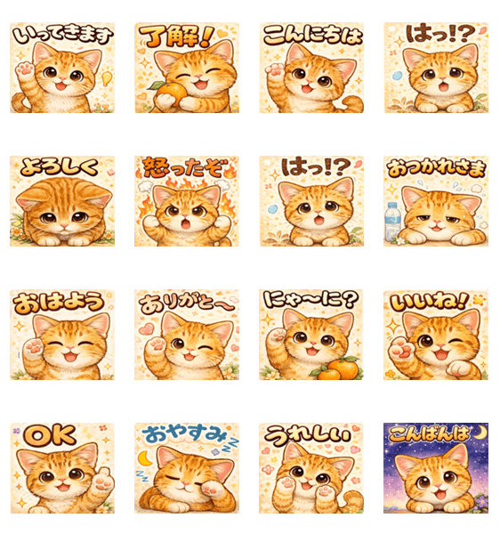 フレンドリーなオレンジ猫「みかん」の、かわいい日常スタンプ。 あいさつやリアクション、毎日のトークにぴったりです。