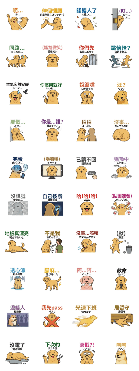 ゴールデンレトリバー「リャンリャン」のスタンプ登場!気まずい笑顔や定時退社など、日常で使いやすいリアクションがいっぱい。可愛く気持ちを伝えよう!