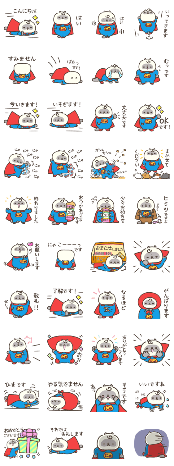 手描き/ネコのヒーロー スーパーニャン。毎日使える日常会話をかっこよくネコらしく面白く表現。ゆるい敬語。クシャ顔/エキゾチック/手書き/ヒマラヤン/ラグドール/ゆるい
