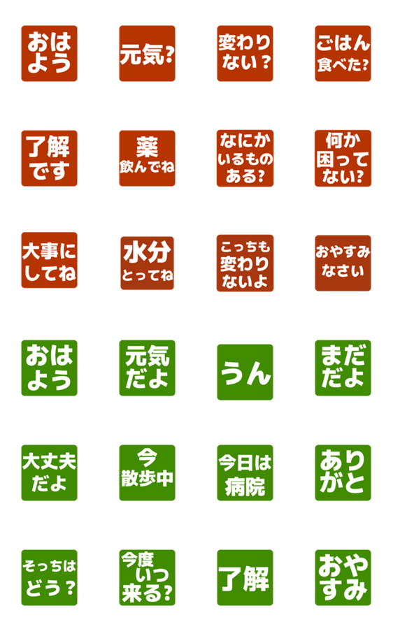 離れて暮らすご両親や家族と日常の確認連絡を押すだけ簡単。オレンジと緑で、質問&返事が使い分けしやすい。おはよう 元気 薬 病院 ごはん 大丈夫 おやすみ