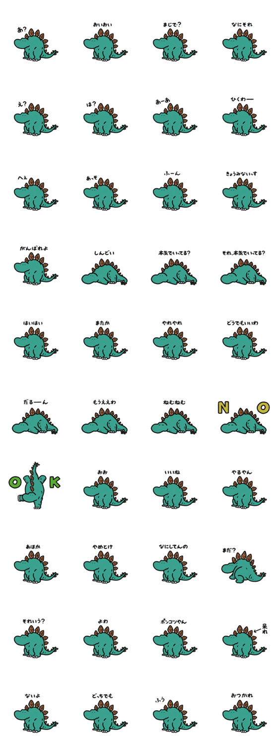 | スタンプ説明 | 少しやんちゃでぶっきらぼうなステゴザウルス。真顔でゆるーく毒を吐いてます。悪気はないみたいです。たまに優しい言葉も混じってます。ゆるい恐竜。ほのぼの癒し。 |
