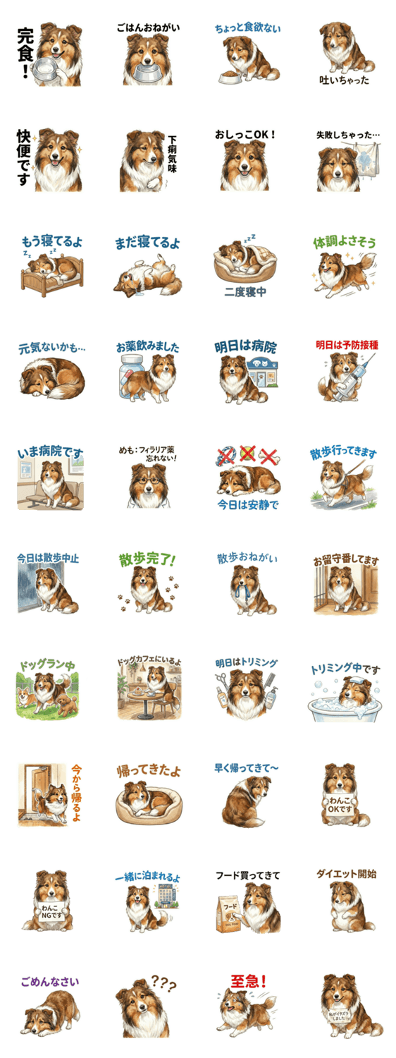 シェルティ(セーブル)と暮らしている人の情報共有用スタンプです。忙しい家族の共有をスムーズに。