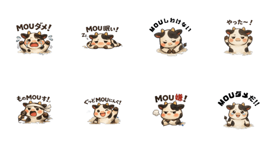 毎日使える牛のキャラクター「MOUシリーズ」のダジャレスタンプです。眠い、嫌だ、ダメ、うれしいなど、日常会話で使いやすい 友達や家族とのやりとりに!