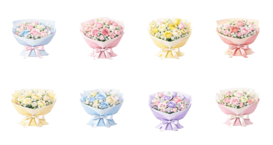 全体のまとまりを意識して構成した花束スタンプです。 花の配置や包み方を整え、安定感のある仕上がりにまとめました。 王道のバランスを大切にした花束セットです