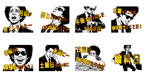 月曜の絶望から日曜の震えまで。働く人の一週間をスタンプ化!同僚や戦友との生存報告にぜひどうぞ。
