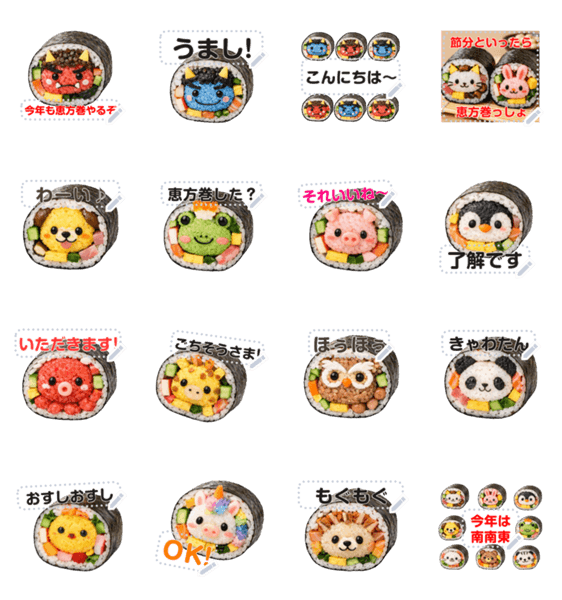 文が書き込める楽しい節分の恵方巻のメッセージスタンプ♥ 赤鬼・青鬼・犬・猫・パンダ・カエル・ペンギン・タコ・梟・ヒヨコ・ハリネズミに豚や麒麟♪ お寿司/太巻き/2月 現在この商品は一部のスマートフォン版LINE 10.3.0以上のトークルームでのみ使用できます。動作環境の最新情報はヘルプをご確認ください。