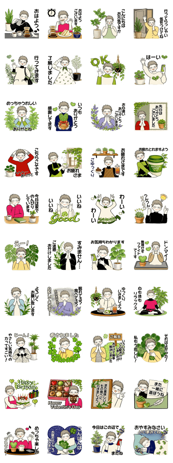 爽やかなグリーンに囲まれたナチュラルなスタンプです。心が温まるやさしいメッセージをお届けします。 日々のスタンプとして、またリフレッシュしたい時などにどうぞ。