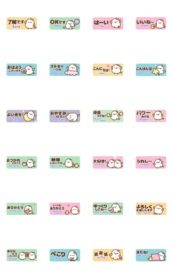 | スタンプ説明 | シマエナガのトリボンが飛びながら気持ちを届ける「省スペース・和&英」アニメーションスタンプです♪ 毎日よく使うメッセージを集めました♫ |