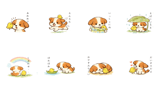 やさしい子犬と小鳥の、ほっこり癒しスタンプです。日常トークやあいさつ、気持ちを伝えるときに使いやすい、あたたかくてかわいいスタンプセットです。