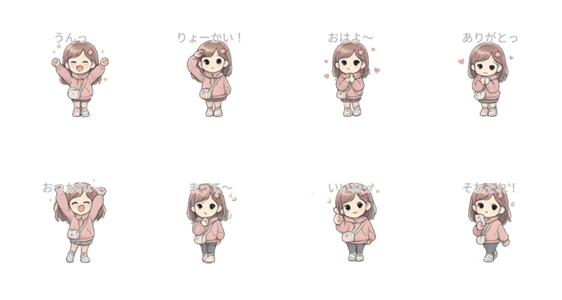 ふんわりタッチの女の子が、日常のひとことをやさしくお届け。誰でも使いやすい“儚かわ”スタンプです。朝の挨拶〜返事まで万能な8種類!