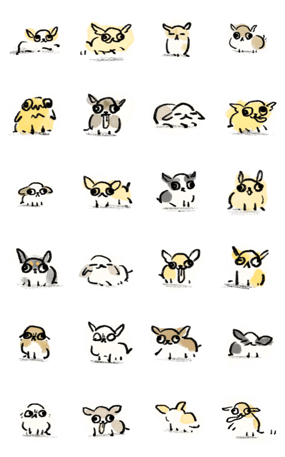 うろ覚えで描いた、手描きの風合いのチワワたちがトーク画面をウロウロするだけの文字なしスタンプです