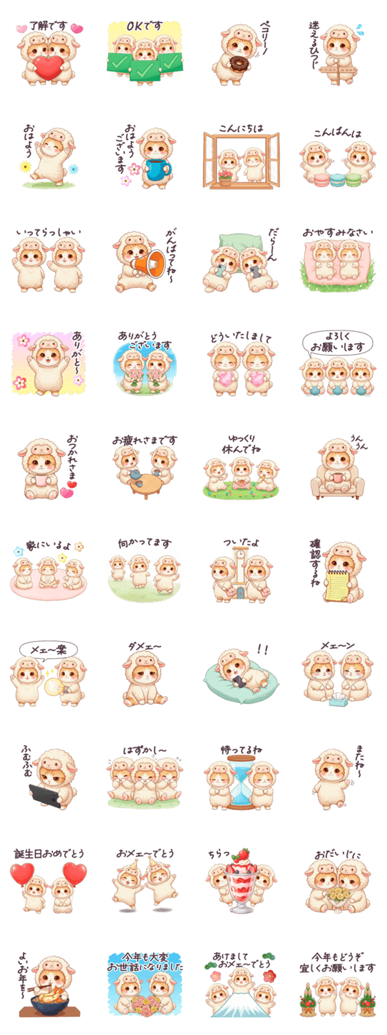 ひつじの着ぐるみ猫のスタンプ。連絡/挨拶/敬語/丁寧/家族/友達/ママ友/猫/ねこ/ネコ/毎日使える/年末年始/年賀状/正月/あけおめ/良いお年を/ヒツジ/2027/ダジャレ