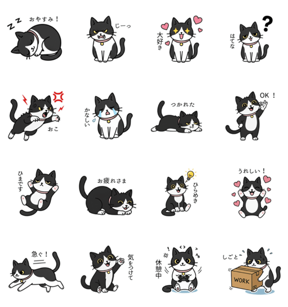 喜怒哀楽を全力で表現する猫。日常のトークを可愛く彩る、感情豊かなスタンプです。