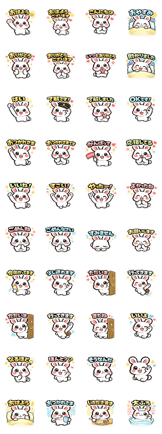 可愛いやさしいうさぎの毎日使える日常会話スタンプです。 「おはよう」「ありがとう」「了解」など、 友だち・家族・恋人・仕事でも使いやすい便利な40個セットです