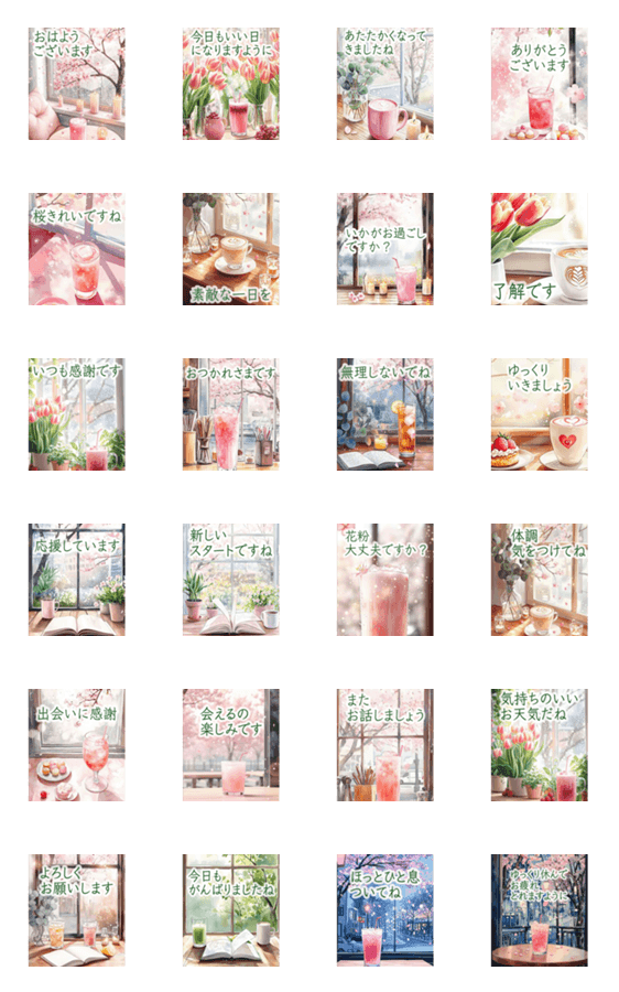 桜が舞う癒しカフェの大人の春セットです。カフェが大好きな方にピッタリです♪お疲れ様/おはよう/了解/ありがとう/カフェラテ/優しさ/大人/春/桜/チューリップ/いちご