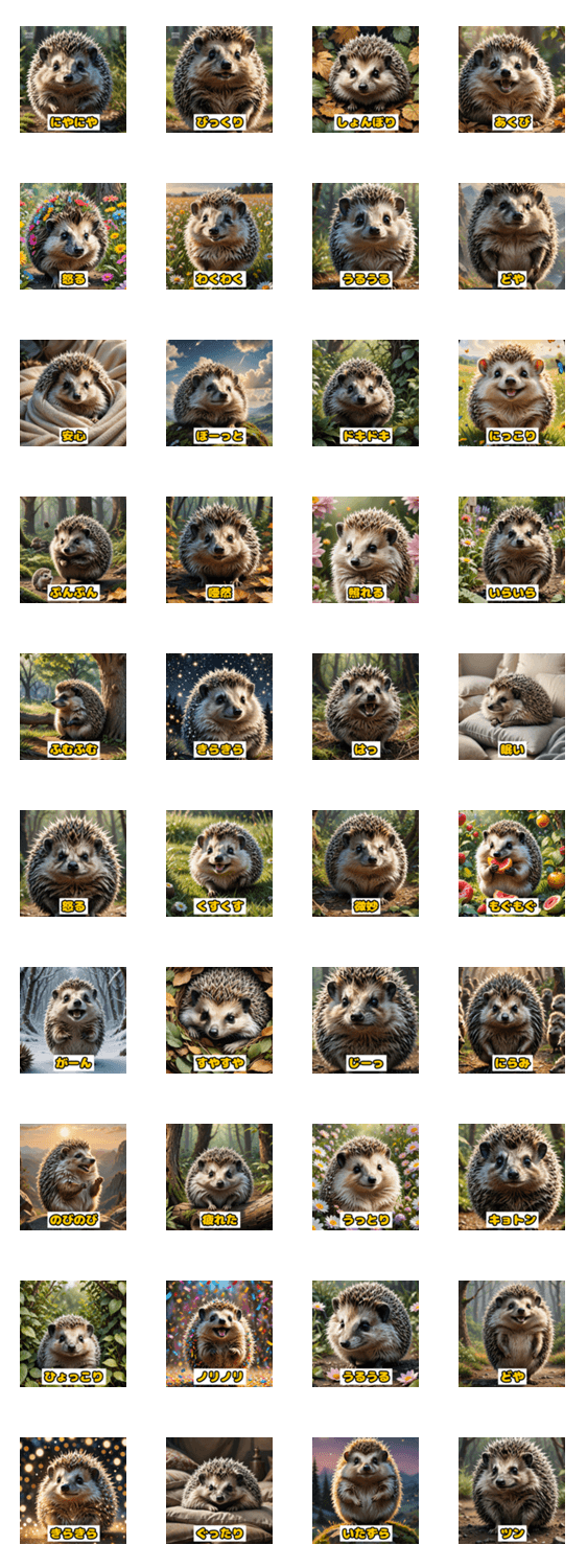 喜怒哀楽からクスッと笑える表情まで、40種類のハリネズミがあなたの気持ちを代弁します。 トークをほっこり彩る、かわいくて使いやすいスタンプです。