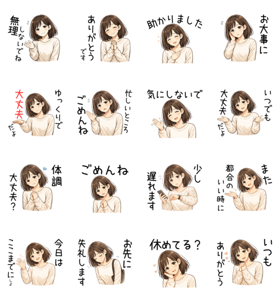 大人女子のための、やさしい気づかいスタンプです。 ありがとうやごめんね、体調を気づかう言葉など、 毎日の会話で自然に使えるフレーズをそろえました。