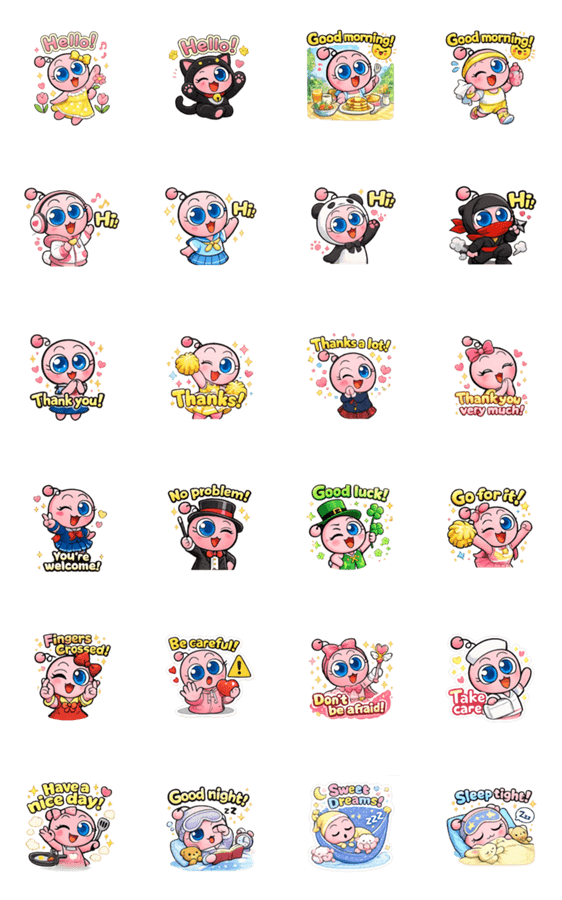 日々の会話で使える簡単な英語メッセージ付きのかわいいスタンプです。ピンクの女の子のキャラクター「ポップ」のあいさつ編です。