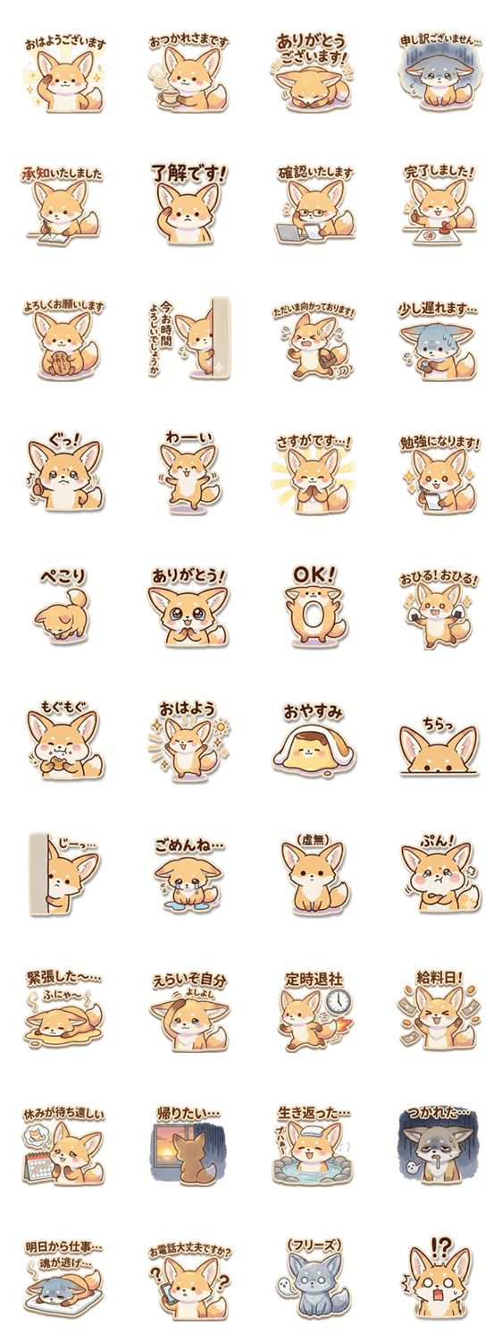 新社会人やビジネスで大活躍!丁寧な敬語から、同僚への本音まで。ふくふくキツネがあなたの毎日をゆるっと応援します。