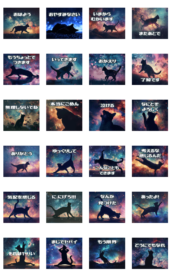 考えるな、感じろ。 夜空を歩く猫が、本音をつぶやくスタンプ。 癒しだけじゃ物足りない人へ。 【宇宙/ネタ/毎日使える/面白い/きれい】