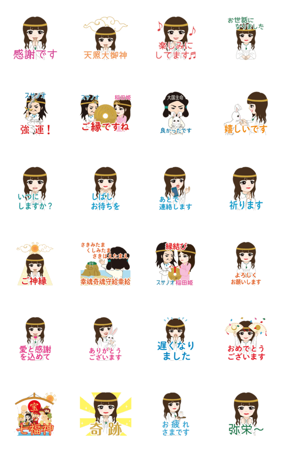 | スタンプ説明 | 世界の聖地や神社仏閣で歌唱するヒーリングシンガー深結の動くスタンプ。日本神話での言葉やありがたいお陰様での言葉を今回お届けします。皆さまに福がありますように。 |