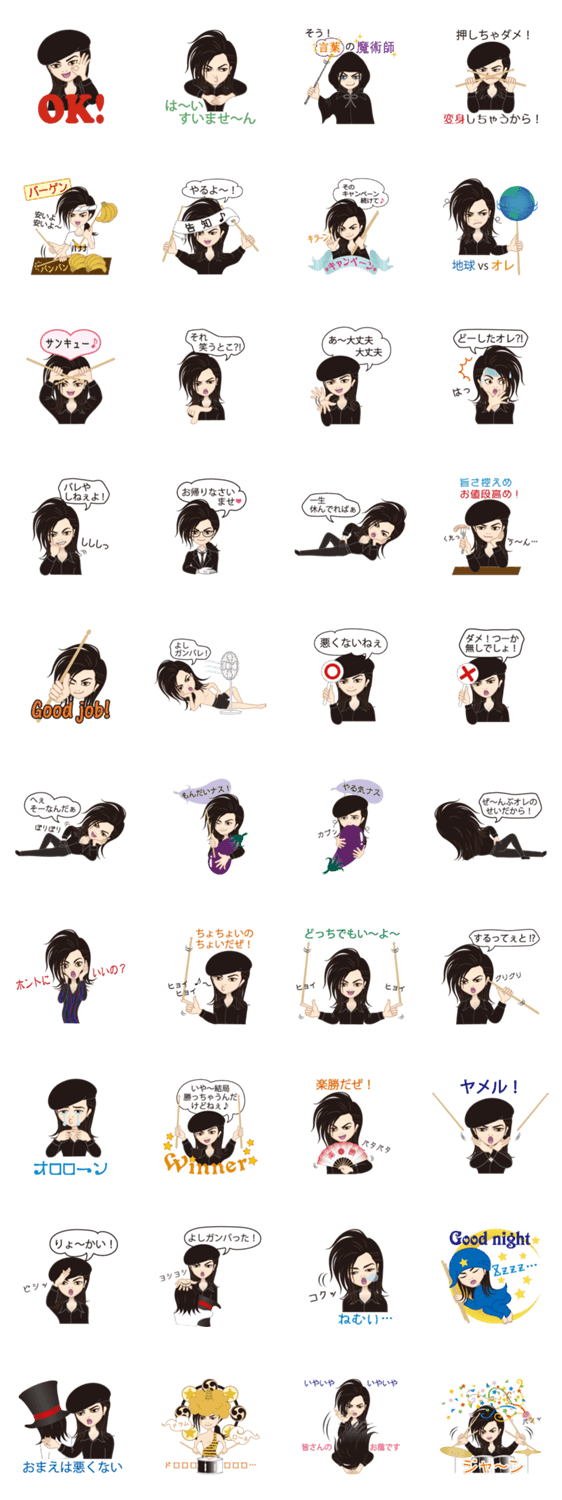 | スタンプ説明 | 1987年ZIGGYにてデビュー、その後LAV・Shammonを経て現在BAD SiX BABiES・tsubaki-VOICE等で活動中。2003年~講師としても活躍ドラマー大山正篤のオモシロ可愛いスタンプ |