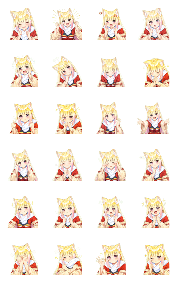 キツネ耳の巫女が和風着物姿で感情たっぷりに使えるスタンプです。かわいいリアクションが日常会話にぴったり。萌え系や和風キャラが好きな方におすすめ。