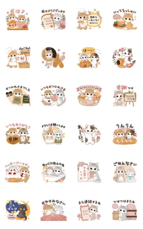 パンとスイーツに囲まれた、ふわふわ子猫たちがちょこんと登場♪ 見ているだけでほっこり癒される、甘くて可愛いスタンプセットです。