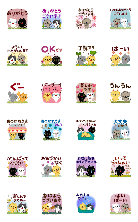 ネコたちイッパイの毎日使えるスタンプです。 ありがとう、おつかれさま、よろしくなど、日常会話に使いやすい言葉を集めています。