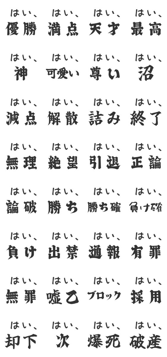 はい、〇〇の文字スタンプ。自虐ネタ、煽り、推し活、レスバなどに。 優勝、解散、論破、尊い、沼、爆死、神、詰み、終了、引退、ブロック、通報、勝ち確、採用、天才、他