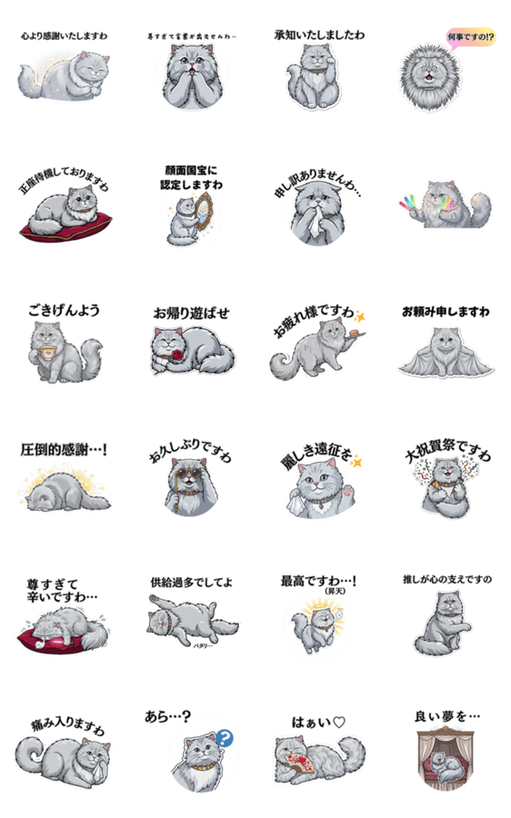 | スタンプ説明 | 優雅なペルシャ猫「ジェミちゃん」の推し活&日常スタンプ第1弾!推しへの愛を叫ぶ時や、毎日のトークに使える便利なセットですわ。 |