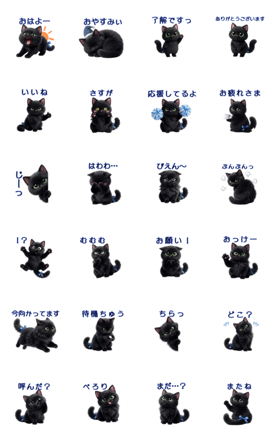 | スタンプ説明 | 大きな緑の瞳と青いリボンが目印。黒猫「ルナ」の日常スタンプです。 おしゃまでクールに見えて実は甘えん坊。 3Dのふわふわな毛並みと毎日使える挨拶でトークを彩ります。 |