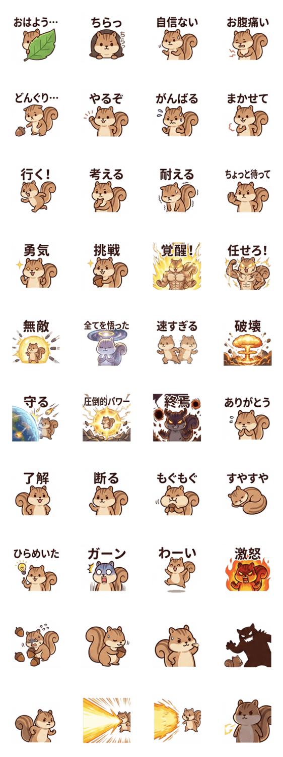 弱気なリスが突如覚醒!日常の挨拶や強気な反応など、日々の連絡で使いやすいスタンプです。