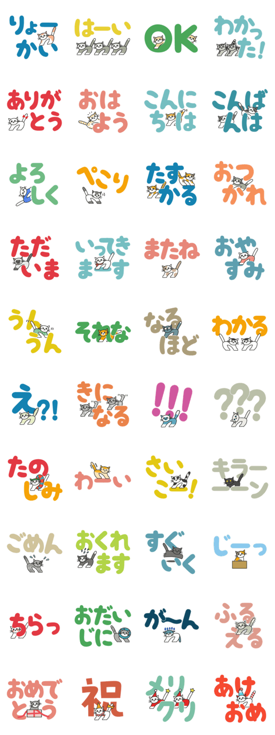 大きな文字で見やすい、ねこの「デカ文字」お返事スタンプです。日常の挨拶や返信、家族や友達への連絡に♪ 猫・カラフル・感謝・大人・大きい・伝わる・毎日使える